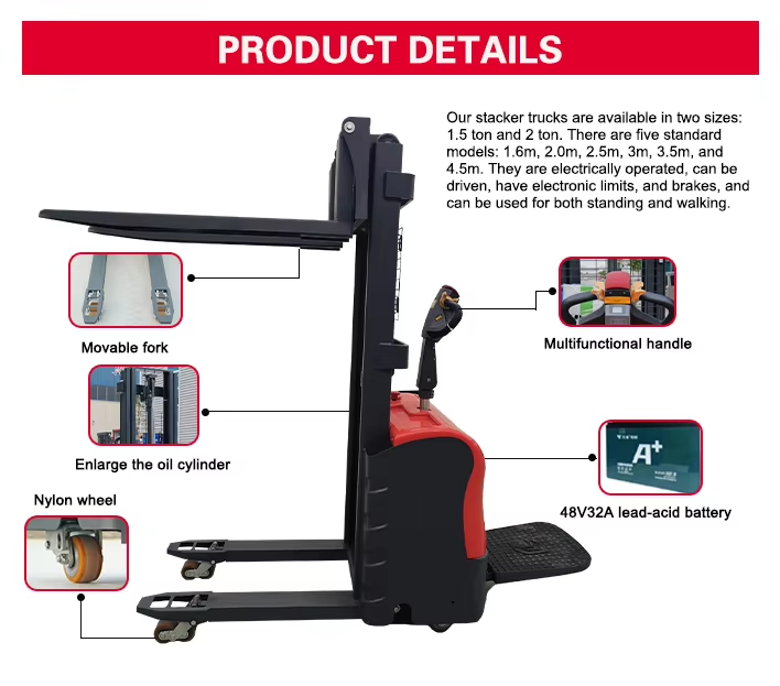 4, Economic Power: Lower upfront cost than full electric stackers, with typical capacities of 1–1.5 tons and lift heights up to ~1.6m.